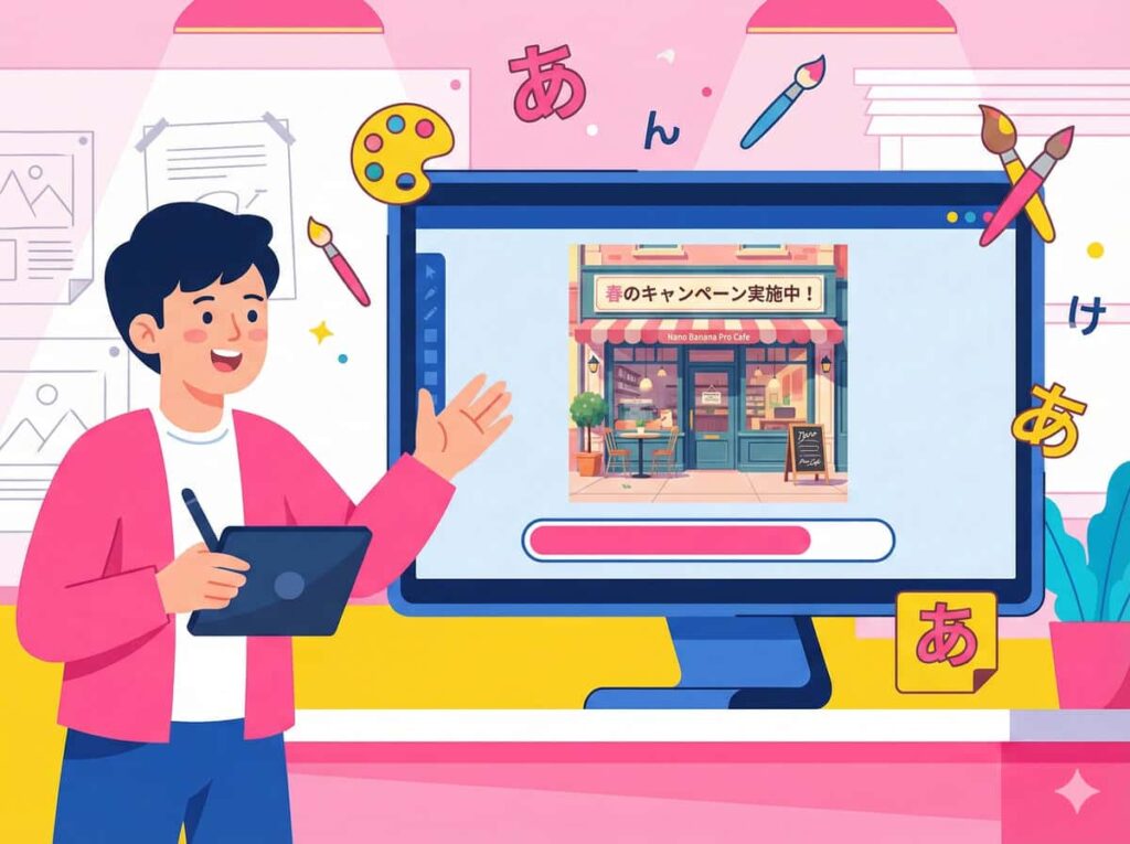 これまでのAIは、画像の中に日本語を入れようとすると文字が崩れてしまうのが弱点でした。しかしNano Banana Proは、プレゼン資料に使う「研修のお知らせ」といった看板や、チラシのキャッチコピーまで、指示通りに正しく描画します。
