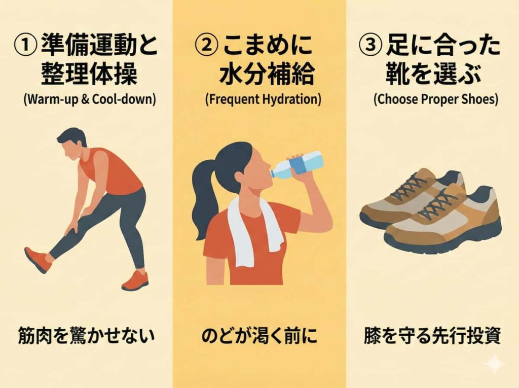 50代の運動において、最も避けるべきは「無理をして怪我をすること」です。安全に、長く続けるための注意点をまとめました。