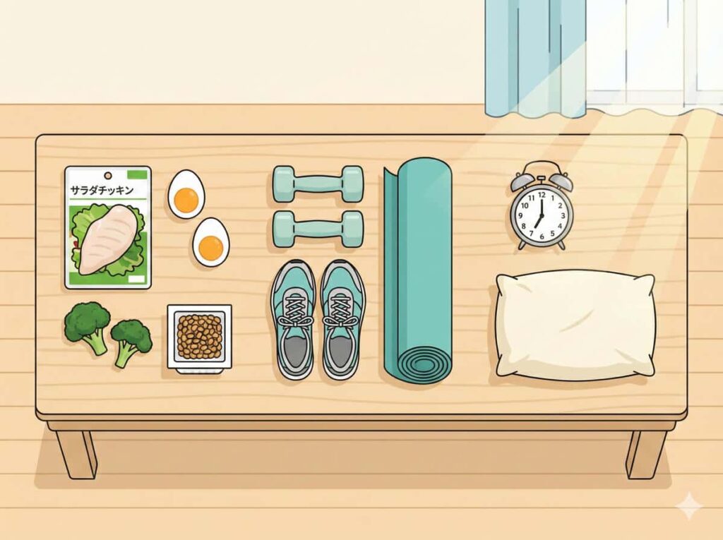 全部やろうとせず、睡眠の立て直し(朝の光)か、タンパク質を1品足すか、5分のスクワットのどれか一つからが現実的です。